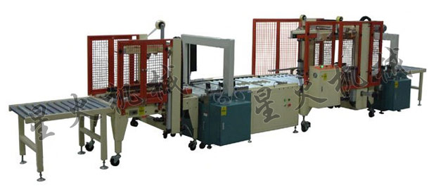 將已經(jīng)裝好并折好上蓋的箱子從左邊的滾筒投入該生產(chǎn)線,這時就會進入第1站的包裝機械即全自動一字型封箱機進行它的一字型封箱,接著就要進入第2站全自動打包機實施打兩道打包帶,進入第3站90度的旋轉(zhuǎn)機,進入第4站全自動角邊封箱機進行四角邊封箱使其形成工字型封箱,進入第5站,也就是很后一站全自動打包機進行打另外兩道的打包帶使其形成井字形打包,這樣就即可完成整個工作流程。